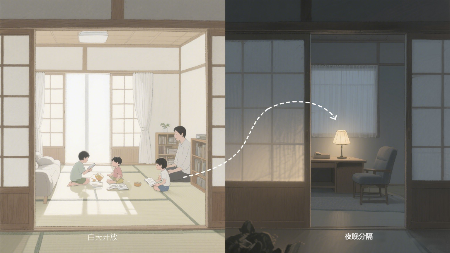 日式风格的空间,从不是 “被分割的盒子”,而是能随需求自由呼吸的存在。白天,将客厅与书房之间的障子门全部拉开,两个空间连成一片,孩子可以在榻榻米上打滚,大人在矮几旁看书,阳光从大窗户涌进来,照亮整个开放的区域;夜晚,拉上障子门,书房便成了独立的静谧角落,台灯的光晕透过和纸,在客厅投下淡淡的影子,温柔又不刺眼。
