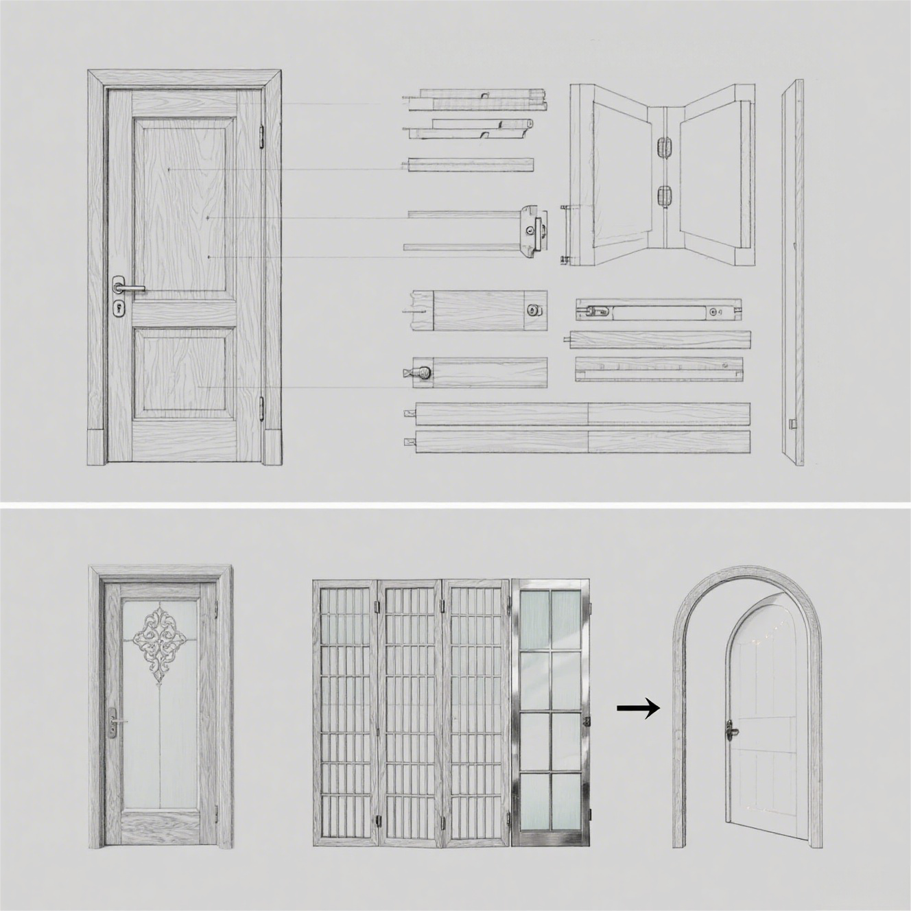 设计门的造型前,得先摸清它的 “家底”。一扇门的基本组成,是门套(包裹门框的装饰)、门页(门板本身)、门锁(功能与装饰的结合)、合页(连接门与框的 “关节”)、门碰(防止门撞击墙面的小装置)。这些部件如同门的 “筋骨”,缺一不可,也为造型设计划定了基础框架。