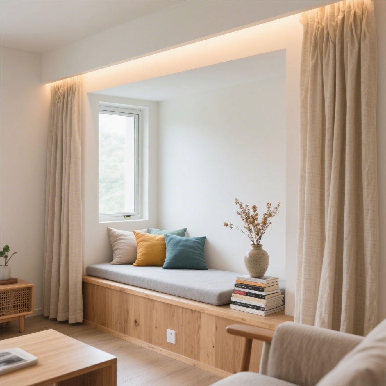 装饰外飘窗,功能定位是首要前提。毕竟飘台的用处可不少,离地 400mm 左右时,能当凳子用,铺上软垫,便是一处惬意的休憩角;离地 700mm 时,摆上电脑和书籍,就成了实用的书桌;即便不特意规划,也能用来搁放书籍、装饰品或沙发背垫,让空间更显充实。所以设计前,得和业主好好沟通功能需求,是想打造成阅读角、工作台,还是休闲区,再结合所在的室内空间量身定做。