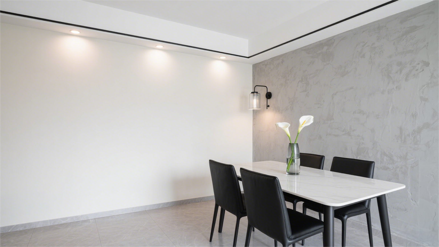 顶面的装修材料选择相对简单,核心是配合空间采光。若做吊顶,石膏板是常用材料,重量轻、易造型,表面刷纯白色乳胶漆,能最大化反射光线,让餐厅更明亮;不做吊顶的话,直接在原顶刷白色乳胶漆,简洁利落,还能拉伸空间高度,尤其适合小户型。