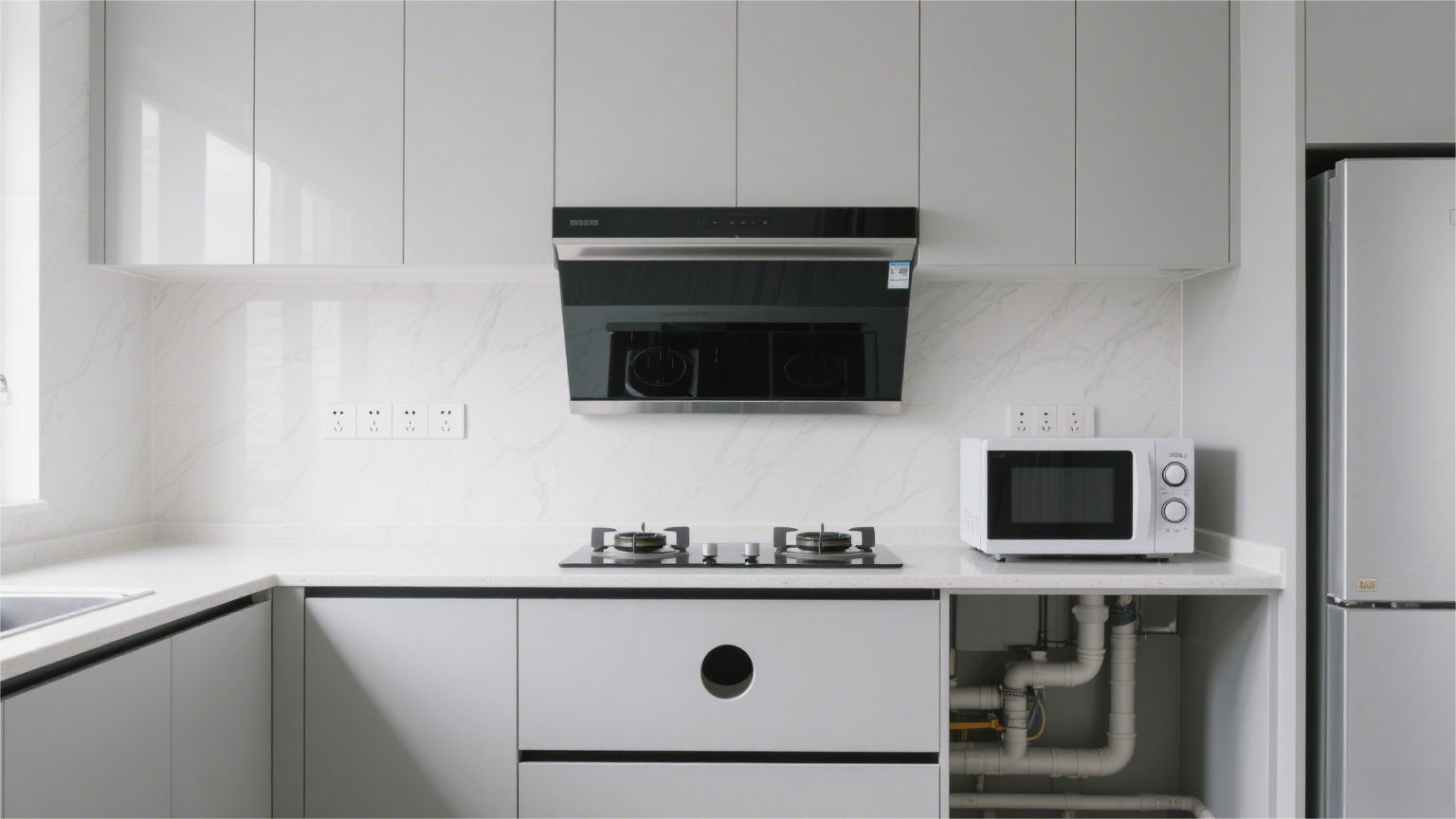 电器位置需提前适配规格:微波炉、烤箱嵌入吊柜时,高度以抬手可及为宜;冰箱旁预留 10-15cm 散热空间;抽油烟机尽量靠近排烟管道,缩短管道长度,且避开窗户(特殊户型除外),避免遮挡光线。开关插座与电器位置对应,均带防潮罩,兼顾安全与便捷。