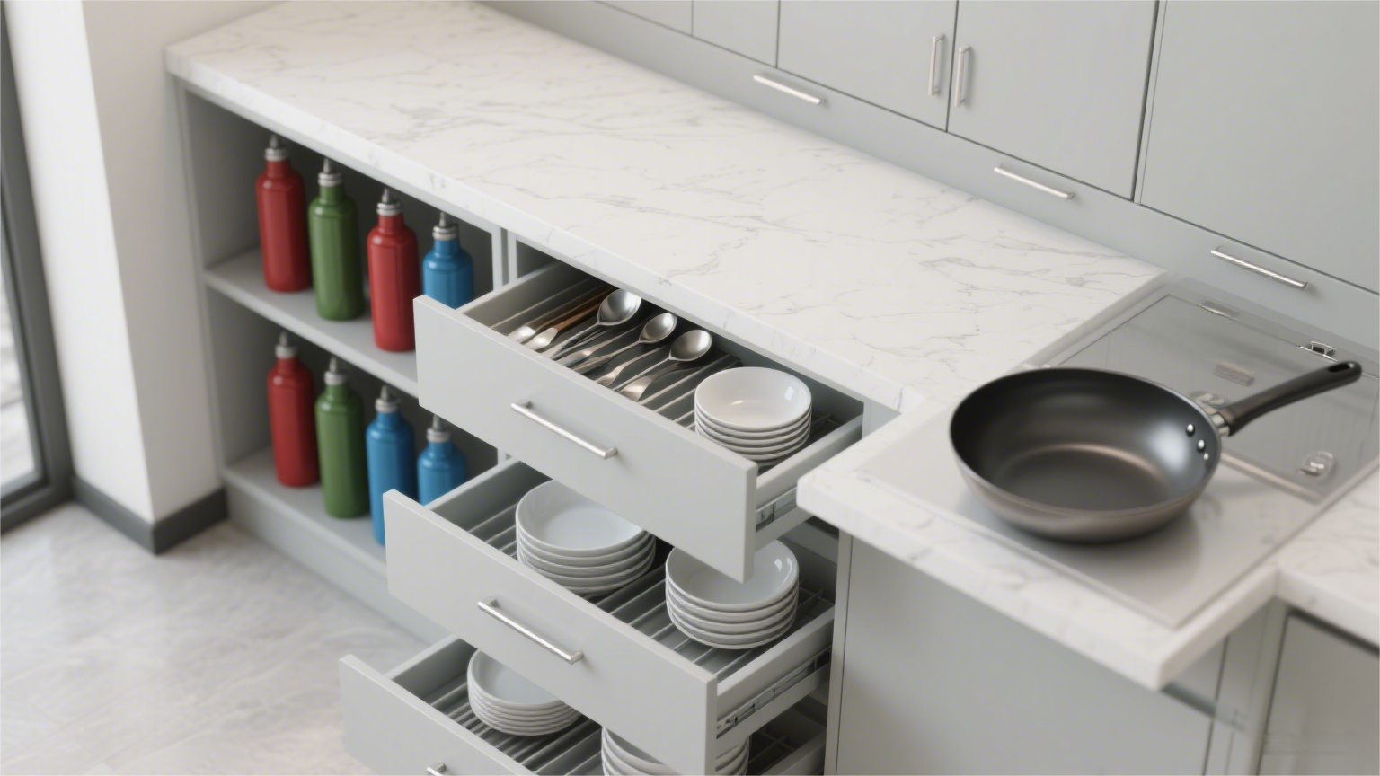 厨房整洁的关键在于 “分类收纳”。地柜需针对性布局:水槽旁设抽屉收纳锅铲、抹布,下方预留米桶、垃圾桶位置,可嵌入液化气罐(若使用);吊柜分层储物,上层放不常用餐具、干货,下层收纳调料瓶等高频物品,搭配分区隔板,告别翻找的繁琐。