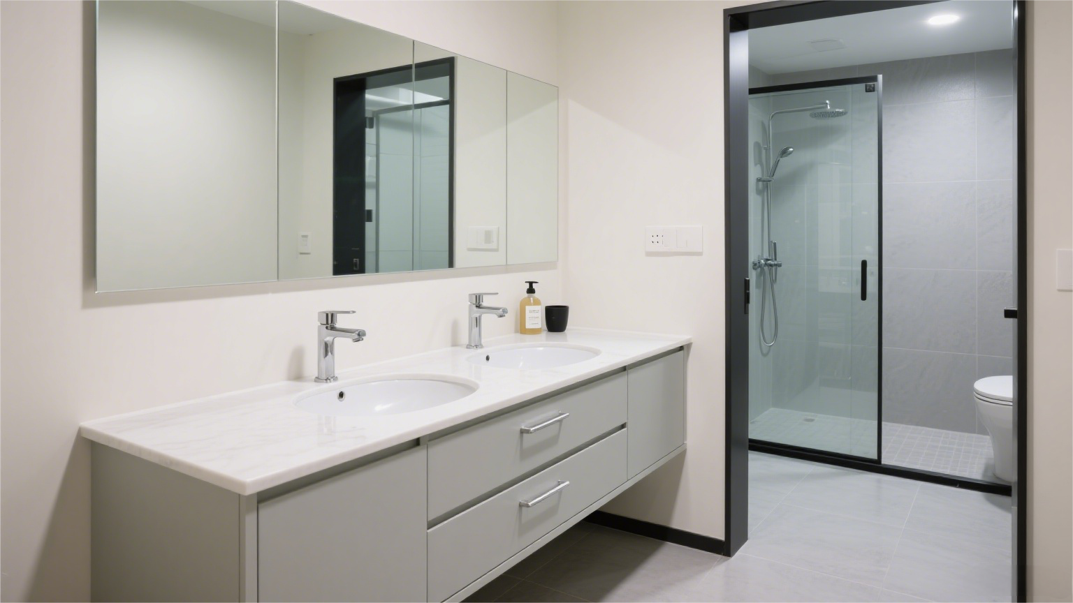 封闭 + 半开敞:用半透明玻璃或轻体墙将如厕区、淋浴区封闭,盥洗区设计为半开敞式。玻璃隔断既保证隐私,又让光线流通,适合采光一般的卫生间。