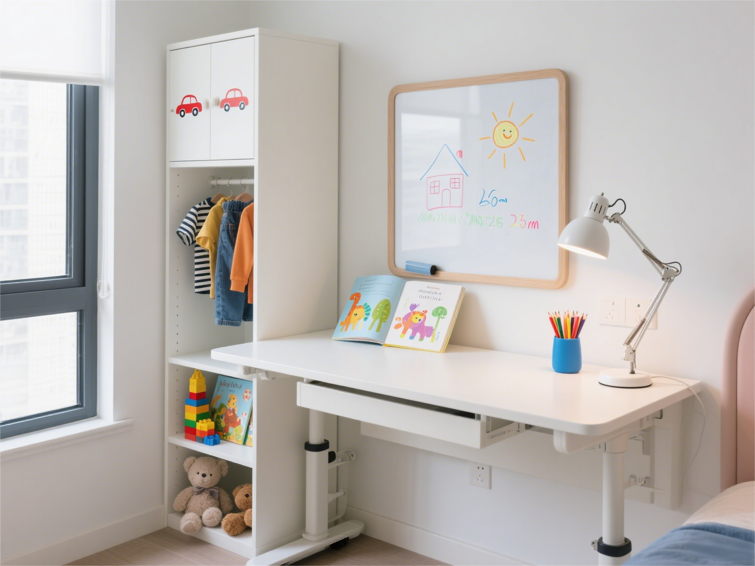 小细节激发兴趣:书桌旁的墙贴一张可擦写白板(随时涂画),柜门上印卡通造型(比如蓝猫、汽车),让学习区像 “游戏场” 一样有趣。台灯选护眼款,色温 4000K 左右,照亮桌面不晃眼。