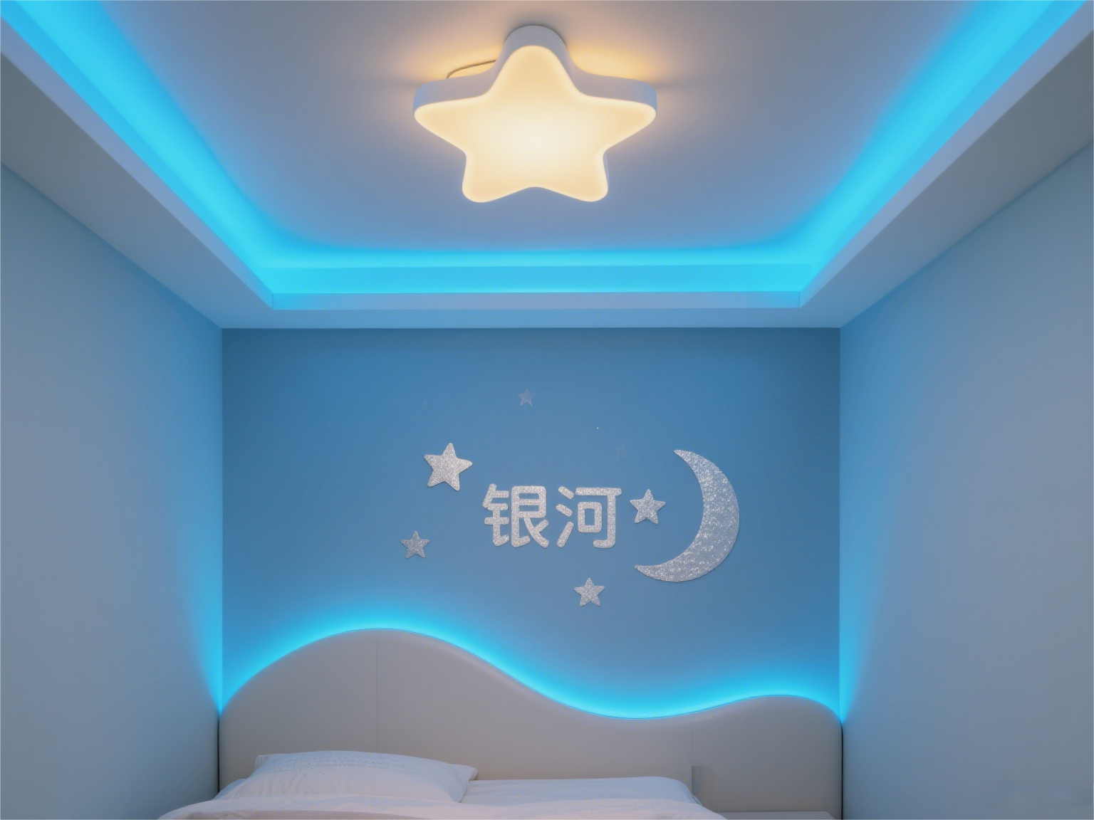 最受欢迎的是蓝色背景光:光线从顶部或墙面反射下来,像淡淡的月光洒在房间里,搭配天花板上的星星贴纸,瞬间变成 “人造银河”。孩子睡前躺在床上,看着这片 “星空”,想象力会飞得很远。