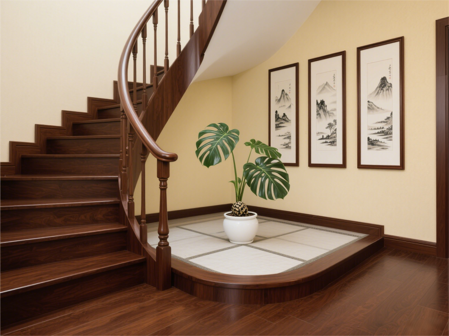 这种楼梯适合大户型或别墅,搭配美式、新中式风格都很和谐。走在上面,脚步声被台阶缓冲得很轻,晚上起夜也不会吵醒家人。