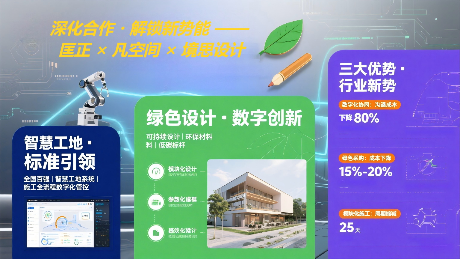 近日,全国百强装饰企业匡正装饰与珠海顶级设计品牌凡空间、境思设计深化战略合作,聚焦 “数字化协同”“绿色技术融合”“定制化服务升级” 三大新优势。三方通过技术资源整合(如匡正 “智慧工地” 系统、凡空间绿色设计、境思参数化模型),实现施工效率提升与成本优化,推动装饰行业向 “数字驱动、绿色导向” 转型,为客户提供智能办公、连锁餐饮等定制化空间解决方案。