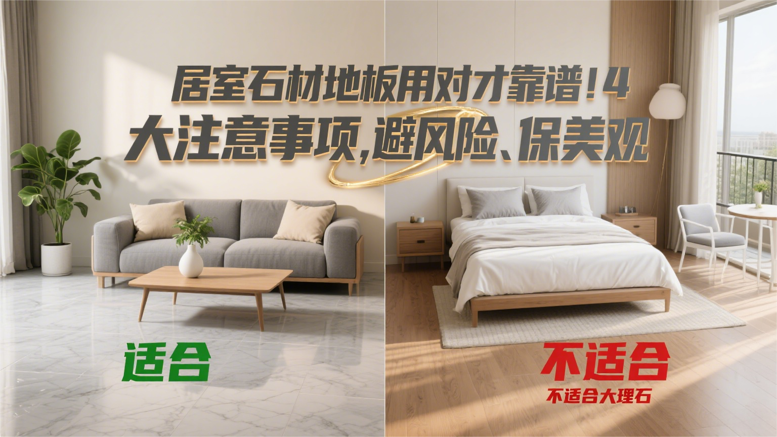 居室用石材地板需注意 4 点:一选放射性达标的环保石材,保障健康;二分清适配区域,适合客厅、厨卫,不适合卧室(脚感硬)和阳台(大理石易风化);三同批备足料,宁多勿少,避免色差;四按房间净宽度选规格,可咨询专业人士,确保铺设整齐。