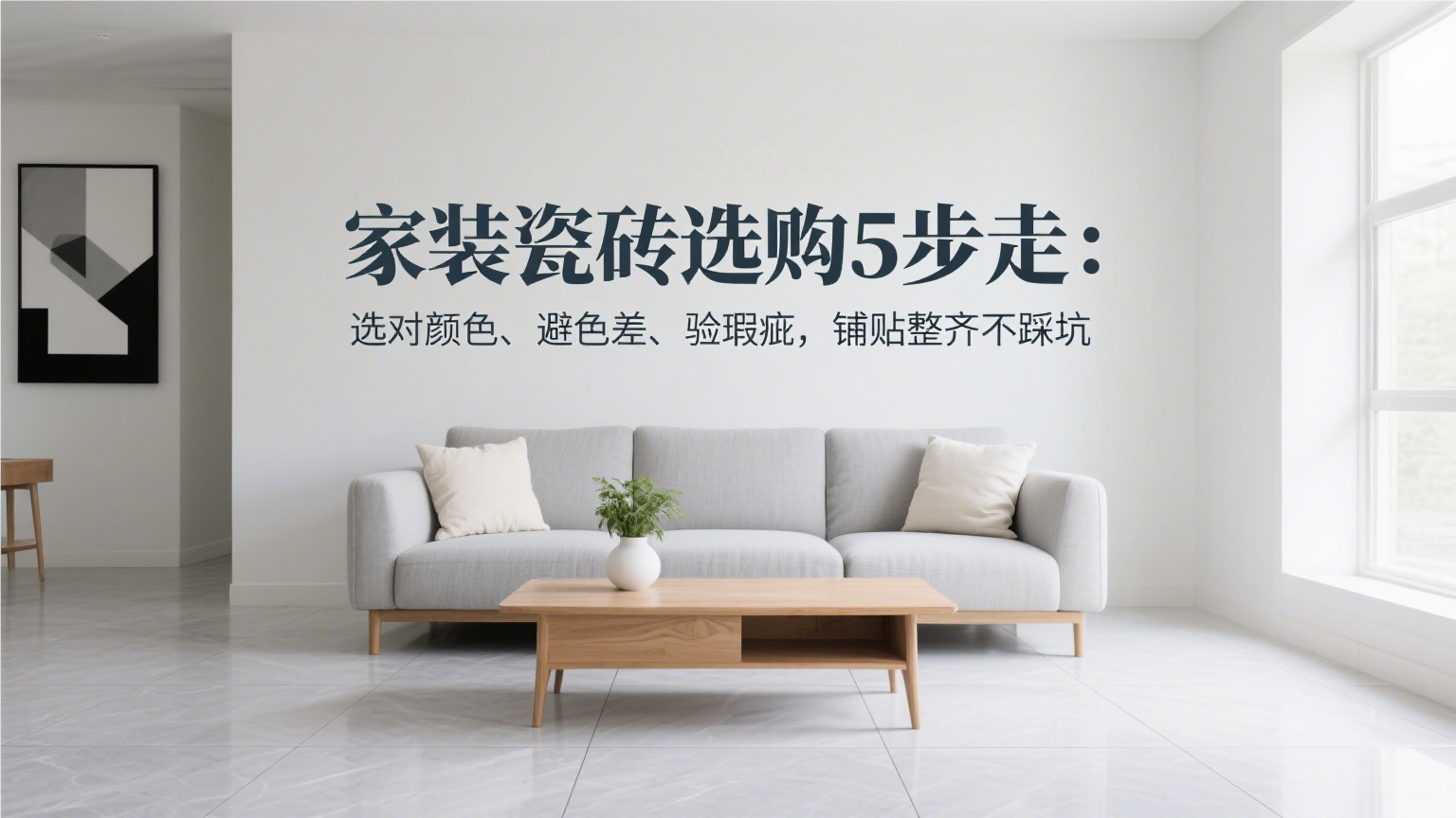 家装瓷砖选购需 5 步:一结合房间采光、墙体门窗颜色选协调的颜色规格,可摆 1㎡瓷砖试效果;二查色差,开箱验同箱瓷砖,足量采购同批次,铺贴前再核对;三验外观,看表面平整、釉面均匀、无破损;四测尺寸,叠放查偏差(300mm 以下 ±1mm,以上 ±2mm);五拼合看缝隙,缝隙小规整度好,助选到适配且优质的瓷砖。