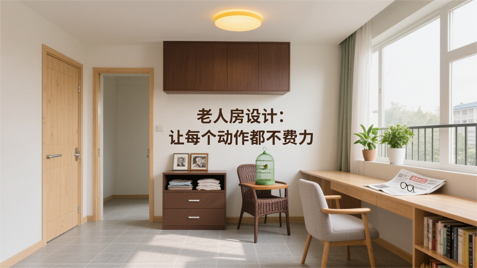 老人房设计需贴合老人身体特点,体现方便实用。门要轻便宽敞,地面无门槛(高低差用缓坡);阳台开放留活动空间,便于老人休闲;储存用半开半闭综合柜,方便存取物品;设读写角满足精神需求。让老人在房间内活动自如,生活舒适。