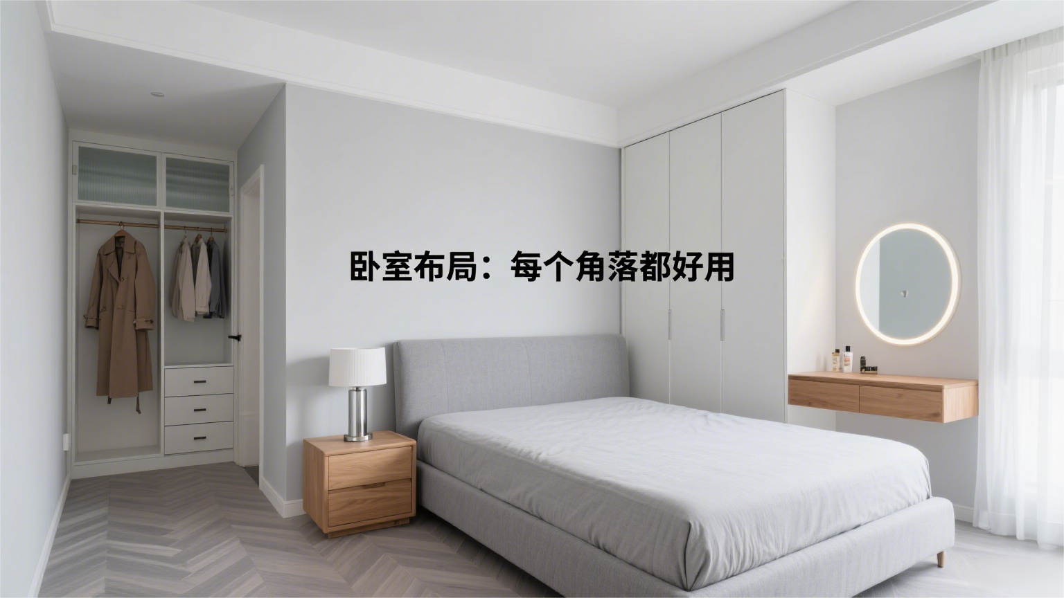 卧室功能布局以床为中心,兼顾睡眠、储物等需求。床的位置需留足过道(≥60cm),儿童床注重安全(护栏、台阶防护);衣柜按衣物分类设计,确保开门顺畅;梳妆台、电视柜可与其他家具结合省空间。小户型重多功能,大户型可分区,核心是动线顺畅。