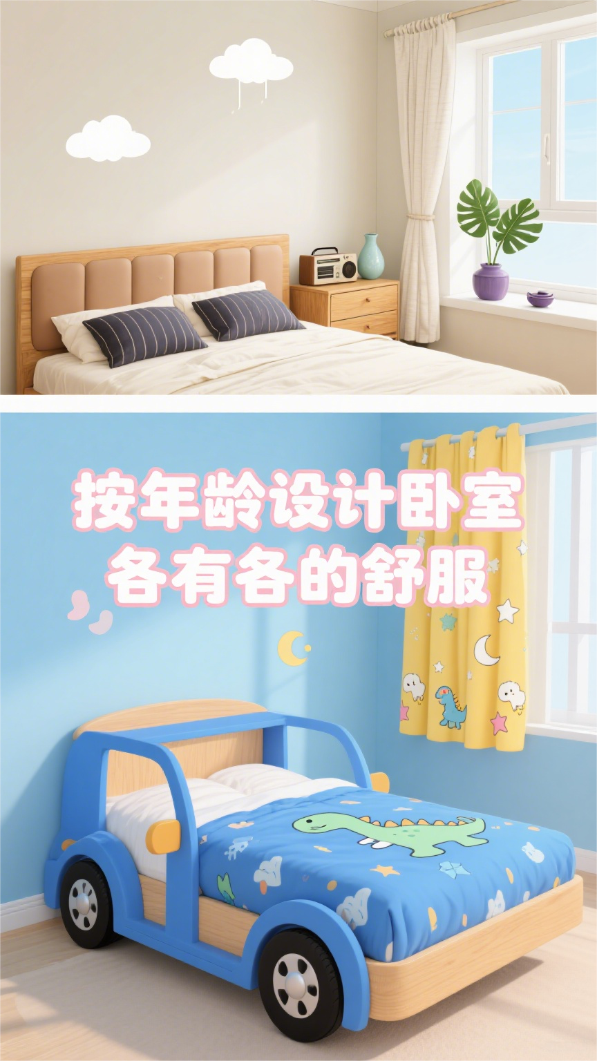 卧室设计需按年龄调整。老年人卧室选朝南房间,用淡雅色调、圆角家具,注重采光和实用,摆放绿植与老物件;儿童卧室依喜好选色彩造型,家具需圆角、可调节,灯光柔和,兼顾安全与童趣。两者均需保证私密与舒适,细节随需求变化。