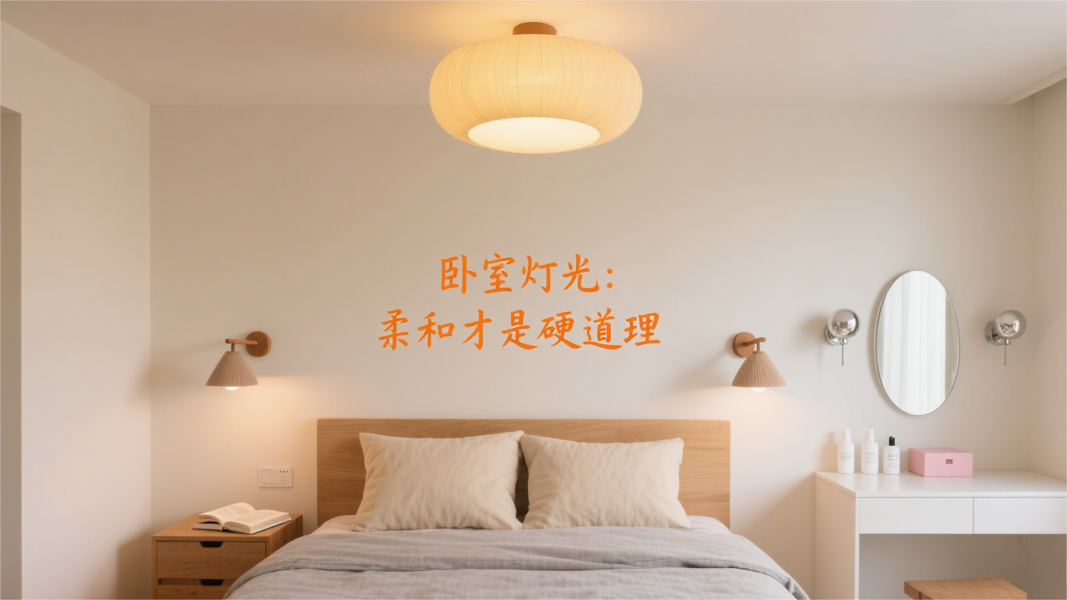 卧室灯光设计以柔和为原则,分普通、局部、装饰照明三类。普通照明用暖光,设双开关方便使用;局部照明含床头阅读灯(避免直射)、镜侧灯(无阴影)等;装饰照明可增氛围。灯具无需过多,实用即可,以营造舒适休息环境为核心。