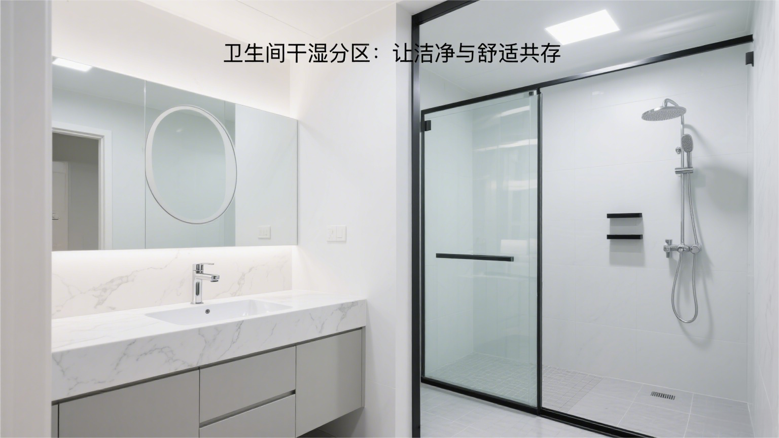 卫生间干湿分区通过分离盥洗、如厕与淋浴功能,减少潮湿与交叉干扰。淋浴区可用淋浴房、玻璃隔断或浴帘分隔;条件允许时,盥洗区可独立设置为半开敞式。这种设计能保持干区干爽、提升使用效率,是现代卫浴设计的实用方法,让卫生间更洁净舒适。