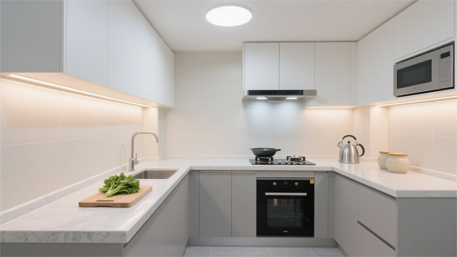 厨房采光设计以自然光为首要光源,需保留原窗且避免窗下设置灶台。人工照明分基本照明(远离炉灶)和局部照明(吊柜底部补光),灯具选防雾防潮的日光灯。墙面和顶面用浅色调增强反光,提升整体亮度。